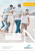 Wanneer je er niet meer bent, zullen je erfgenamen tal van zaken moeten opzoeken, zoals contractgegevens en paswoorden. Misschien kennen je erfgenamen je wensen ook niet. Wat wil je bijvoorbeeld doen met de zorg van je huisdier? Welke artsen zijn jou aan het behandelen? Al deze informatie is bijzonder nuttig, ook tijdens je leven. Om alles eenvoudiger te maken voor je naasten, kan je al deze belangrijke gegevens en overzichten verzamelen in ons notarieel zakboekje 'Richtlijnen aan mijn naasten'.