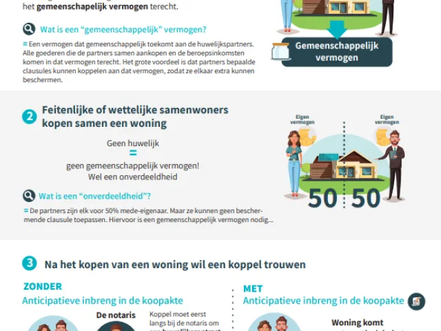 Zo kan de notaris jullie voorstellen om met een anticipatieve inbreng Het nieuw huwelijksvermogensrecht dat in werking treedt op 1 september 2018 introduceert de ‘anticipatieve inbreng’. Partners die vóór het aangaan van een huwelijk samen een goed hebben aangekocht, kunnen - voor zover zij elk exclusief en ten belope van gelijke delen volle eigenaar zijn van de woning (50/50) - in de aankoopakte een verklaring van anticipatieve inbreng laten opnemen. Dankzij deze verklaring zal het goed, op het moment van hun huwelijk, automatisch tot het gemeenschappelijk vermogen behoren. De inbreng zal dus niet meer moeten gebeuren via een huwelijkscontract, wat in sommige gevallen bepaalde kosten kan besparen voor de koppels. te werken. Een handige clausule waarmee je op voorhand het lot van de gezinswoning De gezinswoning is de gezamenlijke hoofdverblijfplaats waar partners met hun gezin normaal leven. Ze hebben er hun ‘voornaamste belangen’. Gehuwden moeten alle beslissingen over hun gezinswoning samen nemen, ook al is maar 1 van hen eigenaar van de woning of staat er maar 1 naam op de huurovereenkomst. Dat is de bescherming van de gezinswoning. Dezelfde bescherming geldt bij wettelijk samenwonenden. kan regelen voor het geval jullie later trouwen. Wil je weten hoe zo'n clausule werkt? Wij leggen het uit in onze nieuwste infofiche!