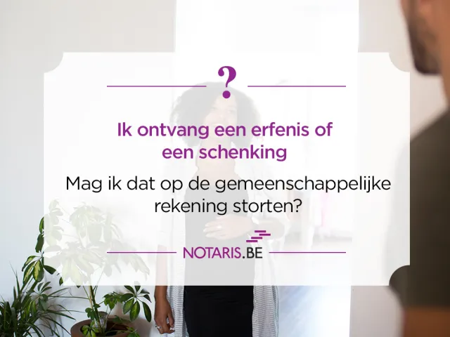 zal je aanraden om de verkregen tegoeden uit een erfenis of een schenking te storten op een eigen rekening, waar geen andere gemeenschappelijke gelden op terechtkomen. Zo zal er geen vermenging met de gemeenschappelijke gelden kunnen plaatsvinden. Dit is de veiligste oplossing.