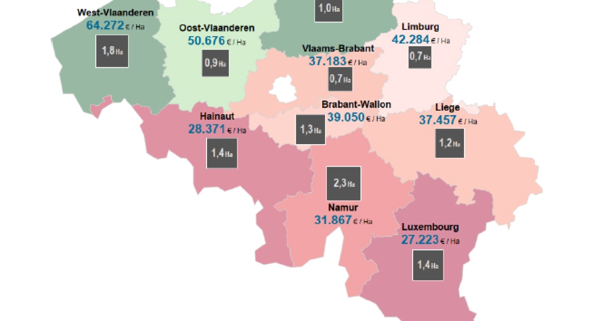 De voornaamste conclusies: de gemiddelde prijs van een landbouwgrond in België in het 1ste semester 2018 klokt af op bijna 45.000 EUR/hectare. De gemiddelde prijs in Vlaanderen varieert van 37.000 EUR/hectare in Vlaams-Brabant tot 64.000 EUR/hectare in de provincies Antwerpen en West-Vlaanderen. 64,1% van alle verkochte landbouwgronden ligt in Vlaanderen.