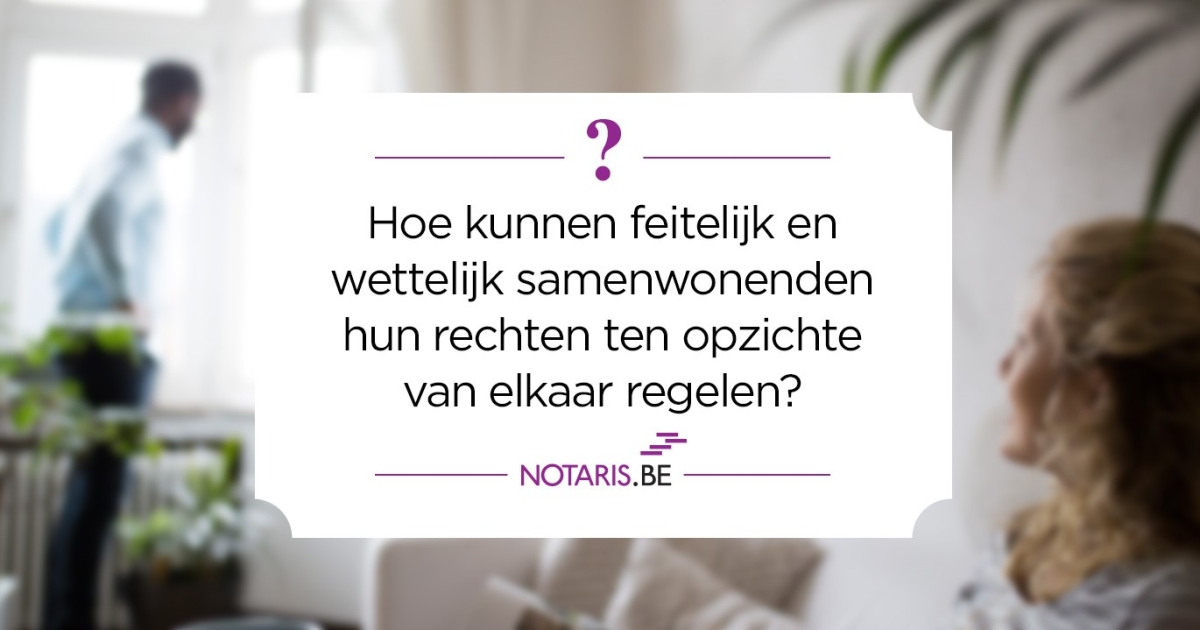 gaan om een samenlevingsovereenkomst op te stellen, maar ze mogen dat zelf ook onderling op papier zetten. Wettelijk samenwonenden moeten verplicht naar de notaris gaan. De notaris zal er op toezien dat de afspraken die de wettelijk samenwonenden maken, stroken met de regels die beschreven staan in de wet.