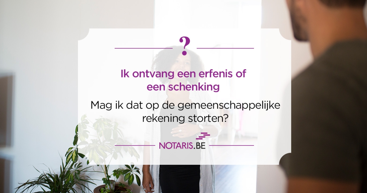 zal je aanraden om de verkregen tegoeden uit een erfenis of een schenking te storten op een eigen rekening, waar geen andere gemeenschappelijke gelden op terechtkomen. Zo zal er geen vermenging met de gemeenschappelijke gelden kunnen plaatsvinden. Dit is de veiligste oplossing.