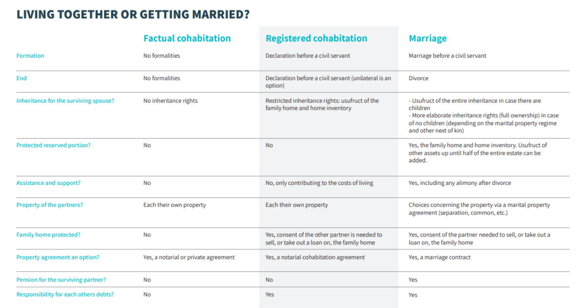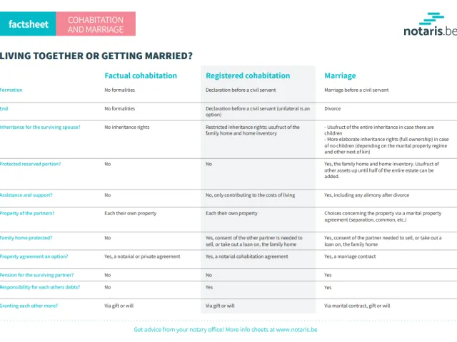 Do you live in Belgium and are you in love? Then you might be wondering if marriage might be for you? In Belgium, there are different forms of cohabitation (factual cohabitation, registered cohabitation and marriage), each with different legal consequences. To get you started, we have created a handy factsheet. Do not hesitate to ask a notary office for clarification.