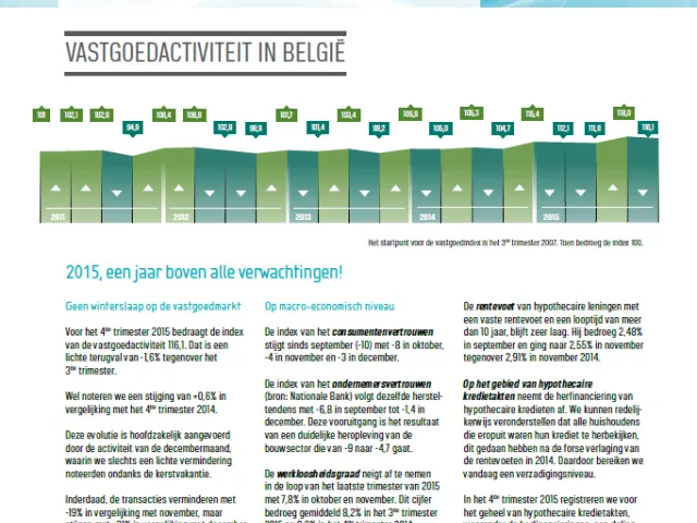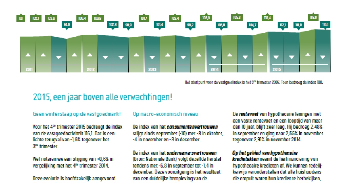 2015 was een uitzonderlijk druk jaar op de Belgische vastgoedmarkt. In vergelijking met 2014 waren er +6,4% meer vastgoedtransacties in ons land, goed voor het beste resultaat van de laatste zeven jaar. In Vlaanderen ging het om een stijging van +4,7% in vergelijking met 2014. Brussel klokte af op +4,8%. In Wallonië was de stijging opvallender: +10,3%.