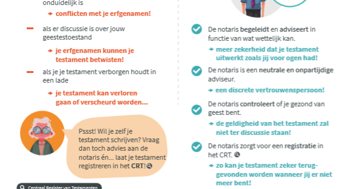 ! Maar zelf zo’n testament opstellen houdt risico’s in. Alles moet kloppen, zowel vormelijk als inhoudelijk. Laat je daarom bijstaan door een